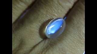 Batu biduri bulan bentuk oval cabochon berukuran 10.97mm x 7.28mm x tebal 5.99mm, berat 3.85 carat, bening dan luster blue flash berkualitas cukup bagus.